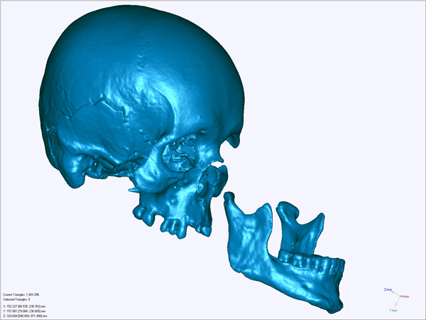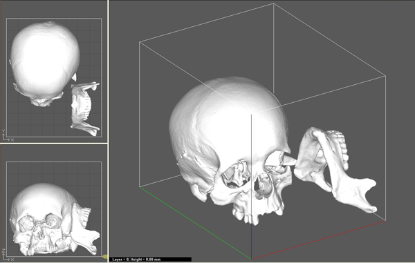 A koponya CT alapján készült 3D rekonstrukció |