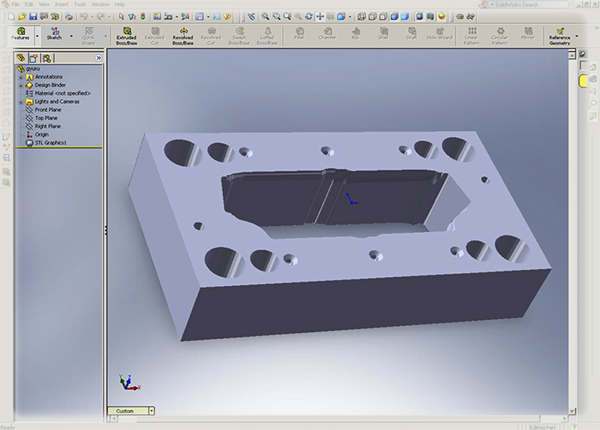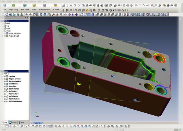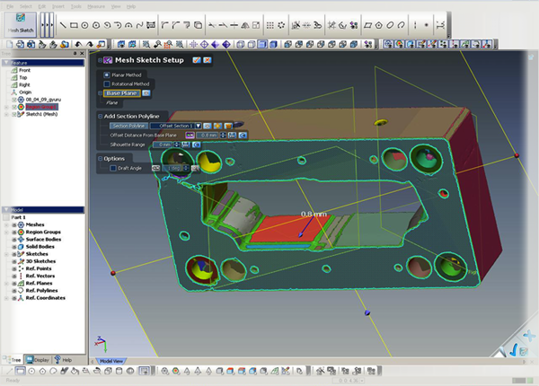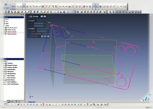 Az újratervezés során a szkennelt pontfelhőből visszépítjük az eredeti modellt. A munka folyamán a Rapidform XOR szoftverrel az egyszerű geomertiai formák megkereshetőek és a pontfelhőre ráilleszthető. Ezután munkasíkok kiválasztásával megrajzolható a kívánt egyedi geometria.